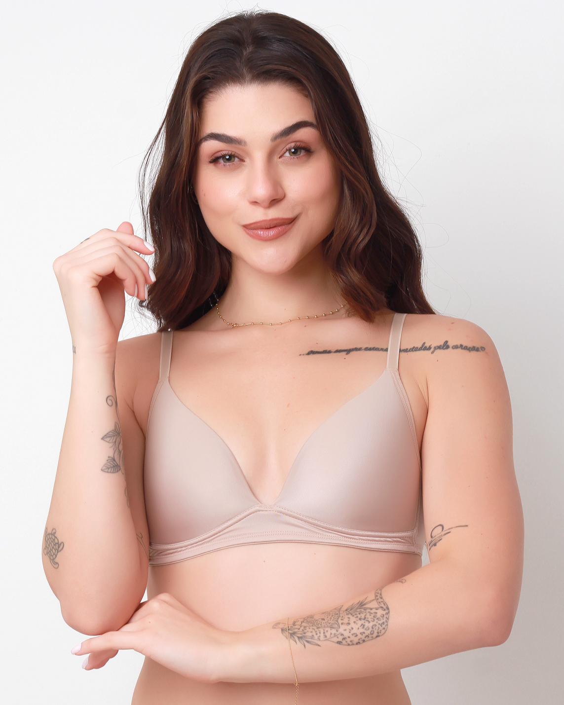 Sutiã com Bojo Triângulo. Confeccionado em microfibra fina, sedosa e macia. Com bojo moldado em formato triangular, sem aro, acomoda e modela os seios confortavelmente. Decote com acabamento que não marca sob a roupa. Cintura com elástico reforçado garante sustentação. Costas com fecho em colchetes. Alças reguláveis.